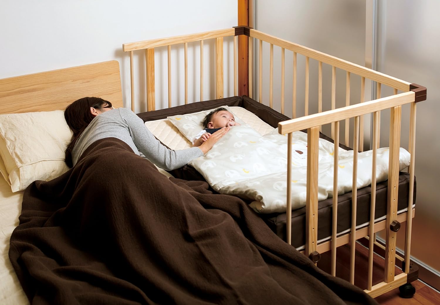 添い寝専用のベビーベッドとして作られた商品で、大人のベッドのサイドに置く事ができます。