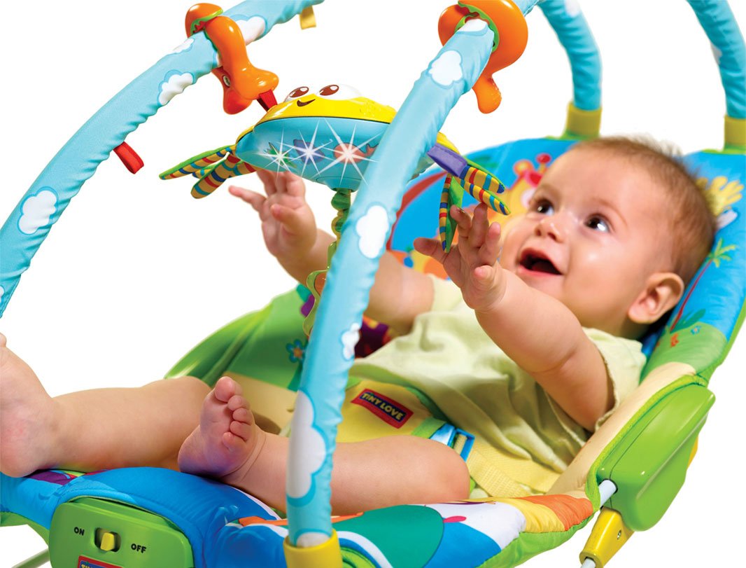 バウンサーで揺られながら、おもちゃに手を伸ばしたり、オルゴールに耳を傾けたりして赤ちゃんが楽しむことができます。